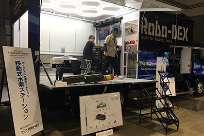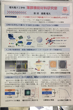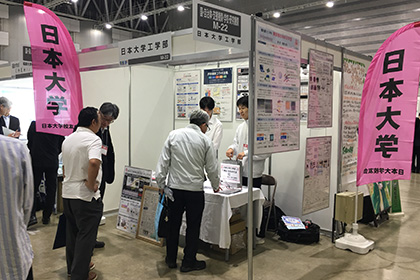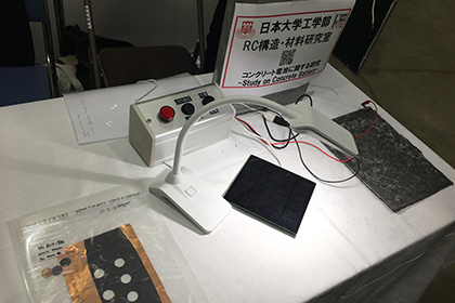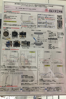 その中で日本大学工学部ブースでは学科横断コラボ企画として、建築学科(RC構造・材料研究室サンジェイ・パリ―ク先生)、機械工学科(エネルギー材料工学研究室:井口史匡先生、サステナブルロボットシステム研究室:武藤伸洋先生)、電気電子工学科工学科(薄膜機能材料研究室:髙橋竜太先生、パワーエレクトロ二クス研究室:江口卓弥先生)らが、「ロボットIoTの研究、コンクリート電池に関する研究、全個体電池に関する機械特性の研究、発電(SOFC)蓄電(キャパシタ)等の各研究」について解説・実演をされ、頻繁に見学者が訪れていました。