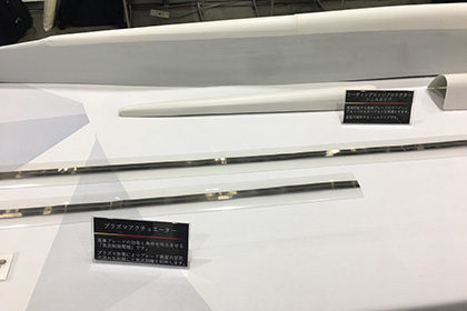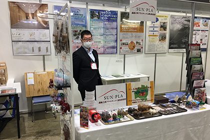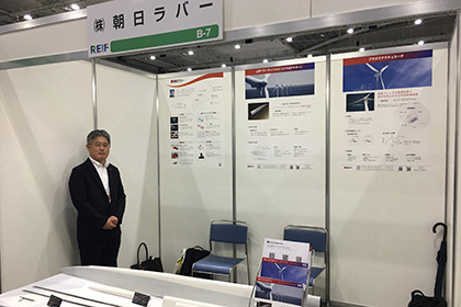 また、(公財)郡山地域テクノポリス推進機構のブースでは、大学敷地内にある郡山地域テクノポリスインキュベーションセンターに入居されている企業の展示がありました。校友企業である(株)朝日ラバー(工化37回:渡邉陽一郎代表取締役社長:埼玉県本社)のブースでは風車ブレード向けシリコーンゴム製デバイスを展示されていました。「知的財産」に関しては福島島県発明協会が相談ブースを設けていました。~