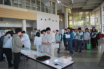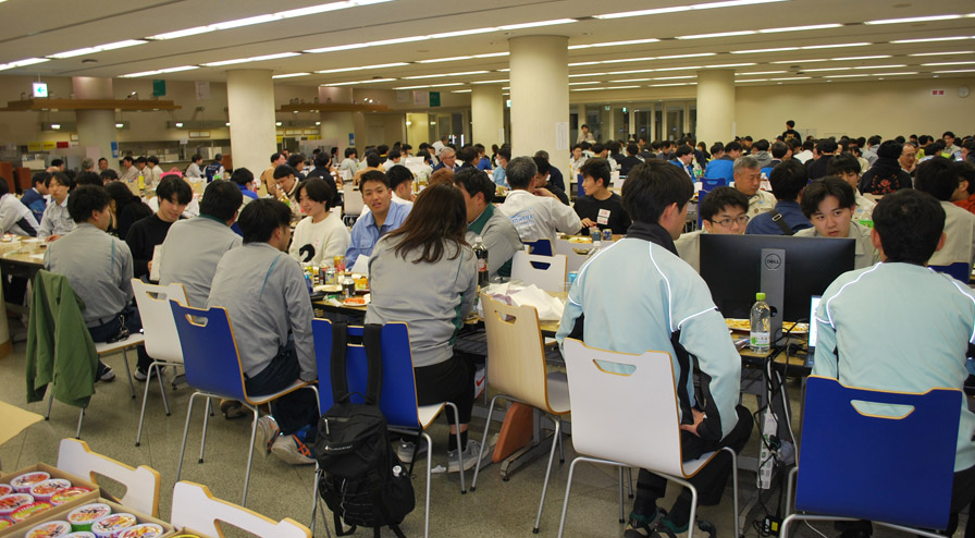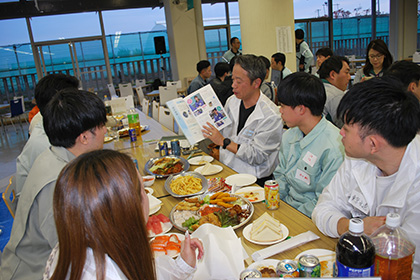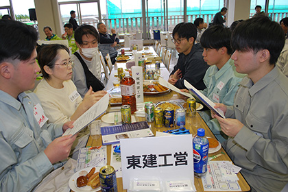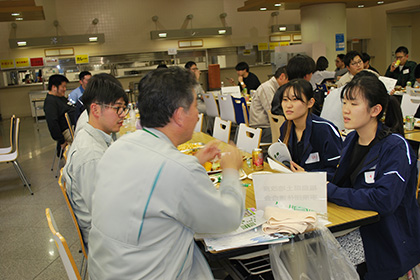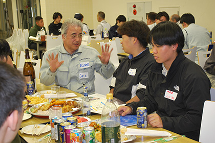 同日清掃作業後に、「就職のミスマッチを減らすために、社会人の先輩から仕事に関するリアルな情報を収集し、就職活動に向けて、社会人とコミュニケーションを取る経験を積む。」を目的に、ハットNE1階学生食堂を会場で、土木工学科の参加希望学生を中心に、他学科の学生も参加し懇親会が開催されました。