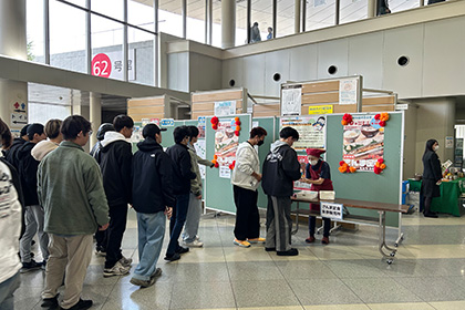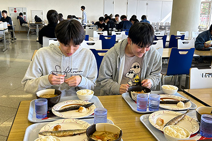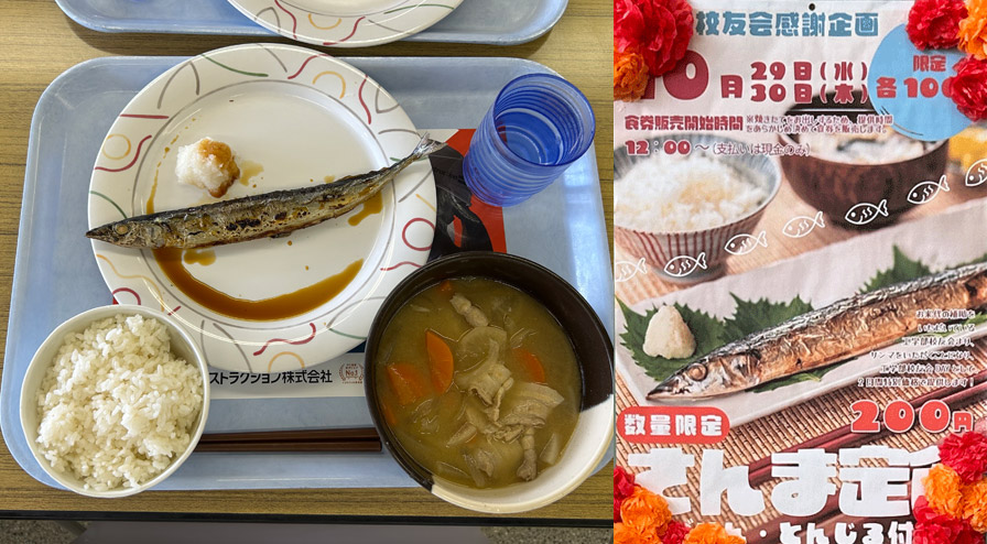 ~10月29日・30日の2日間、「校友会感謝企画 さんま定食200円」として各日、100食計200食が学生食堂で限定メニューとしてお目見えしました。12時のチケット販売時間には学生らが行列をなす人気ぶりでした。